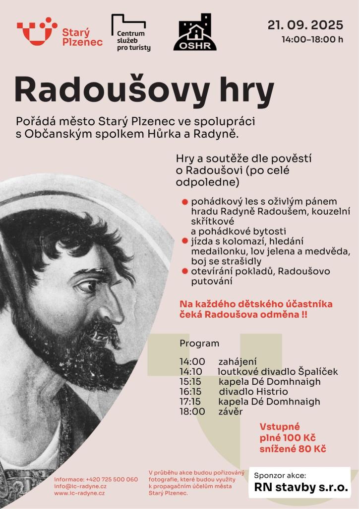 Mladý talentovaný student Martin Stark předvedl staroplzeneckým občanům své filmařské schopnosti prostřednictvím poutavě zpracovaných Radoušových her, které si obyvatelé nejen Plzeňského kraje velmi rychle oblíbili. Letošní druhý ročník navštívilo okolo tisíce rodičů a dětí. Zábavné odpoledne v okolí i uvnitř hradu Radyně přineslo každému spousty radosti, dobré nálady a hlavně mnoho krásné energie.